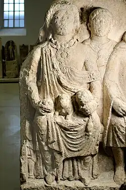 Auf einem Familiengrabstein aus Selzen ist der Vater in Tunika und Mantel überproportional groß dargestellt. Rechts steht die Hausherrin in Menimane-Tracht. Eine zweite weibliche Figur trägt Tunika und Mantel.[4]