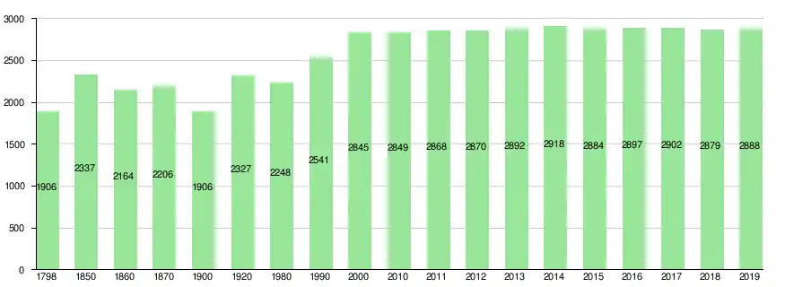 Von 1798 bis 1850 stieg die Bevölkerung stark an (1798–1850: + 22,6 %). Mit Ausnahme des Jahrzehnts zwischen 1860 und 1870 sank die Bevölkerung durch Landflucht in die Industriegebiete stark (1850–1900: − 18,4 %). Innert zwei Jahrzehnten wuchs sie wieder auf den Stand von 1850 an (1900–1920: + 22,1 %). Von 1920 bis 1980 folgte ein Auf und Ab (insgesamt 1920–1980: − 3,4 %). Dann wuchs die Zahl der Bewohner innert 20 Jahren sprunghaft an (1980–2000: + 26,8 %). Seit der Jahrtausendwende stagniert die Einwohnerzahl.