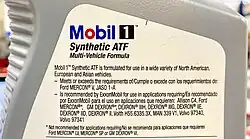 Das rückseitige Etikett: Dieselbe Flasche behauptet, dass die Flüssigkeit von ExxonMobil für den Einsatz in Anwendungen empfohlen wird, in denen die 1987er Ford Mercon-Flüssigkeit sowie GM erforderlich sind Dexron(B), Dexron-II (C), Dexron-II (D), Dexron-III (G), Dexron-III (H) und andere Nicht-Ford-Anwendungen. Die Rückseite hat ein Sternchen, um anzuzeigen, dass die Flüssigkeit nicht mit Mercon LV oder Mercon SP kompatibel ist.