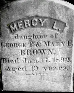 Mercy Brown erkrankte erst drei Jahre nach dem Weggang ihres Bruders. Sie wurde zwar in der letzten Krankheitsphase ärztlich behandelt, jedoch teilte der für Exeter und das benachbarte North Kingstown zuständige Arzt Harold Metcalf ihrem Vater mit, „dass weitere medizinische Hilfe nutzlos sei“. Sie starb nicht nach längerem Siechtum, sondern an der sogenannten „galoppierenden Schwindsucht“ nach kurzem Krankheitsverlauf am 17. Januar 1892.[3] Ihr Nachruf vom Januar 1892 lautete nur knapp: „Miss Lena Brown, die an Schwindsucht litt, starb am Sonntagmorgen.“[2] Sie wurde ebenso wie ihre Verwandten auf dem Chestnut Hill Cemetery der Baptist Church (auch Chestnut Hill Baptist Church) in Exeter beigesetzt.[1]