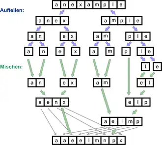 Im letzten Verschmelzungsschritt ist das Reißverschlussverfahren beim Verschmelzen (in der Abb. „Mischen:“) angedeutet. Blaue Pfeile verdeutlichen den Aufteilungsschritt, grüne Pfeile die Verschmelzungsschritte.
