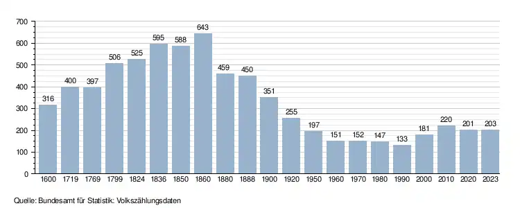 - ↑ Daten der Eidgenössischen Volkszählungen ab 1850 nach Gemeinden. (XLSX; 10 MB) Bundesamt für Statistik, Neuchâtel, 12. Juli 2024, abgerufen am 31. Januar 2025 (Öffnung in Excel nur über "Anhang/Excel-Datensatz" möglich).