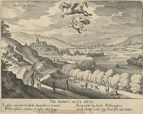 Hoch in den Lüften stürzt Bellerophon von seinem Flügelpferd Pegasus. Zuschauer im Vordergrund sehen dem Todessturz zu. Rechts fließt der Neckar, bei der Neckarbrücke ist Cannstatt mit der Stadtkirche zu sehen. Im Mittelgrund links auf einer Anhöhe die Berger Kirche. Der Sinnspruch „Ne nimis alta pete“ („Wer hoch steigt, fällt tief“) wird illustriert durch Bellerophon, der von seinem Flügelpferd heruntergefallen ist und zur Erde stürzt. Das Sinngedicht lautet: „Steig nicht zu hoch, Bellerophon, Gen Himml reitt, zur Erd felt mit Hohn“. Quelle: #Novae 1624. Literatur: #Merian-Druckgraphik 1, Nummer 459, Abbildung 239, #Wais 1951.1, Seite 85,[9] #Schefold 1957, Seite 632. |