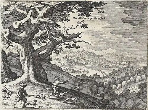 Blick auf eine weite Tallandschaft mit sich windendem Neckar bei Cannstatt, vorn links eine Anhöhe mit einer verkrüppelten Eiche, darunter zwei Jäger mit sechs Hunden, dahinter eine Anhöhe mit einem Schloss, hinten links über dem Tal ein Dorf mit einer Kirche, rechts die Cannstatter Stadtkirche und am Ufer der Brückenturm mit dem Neckartor, im Hintergrund hohe Berge. Quelle: #Novae 1624. Literatur: #Merian-Druckgraphik 1, Nummer 517, Abbildung 297, #Schefold 1957, Seite 638. |