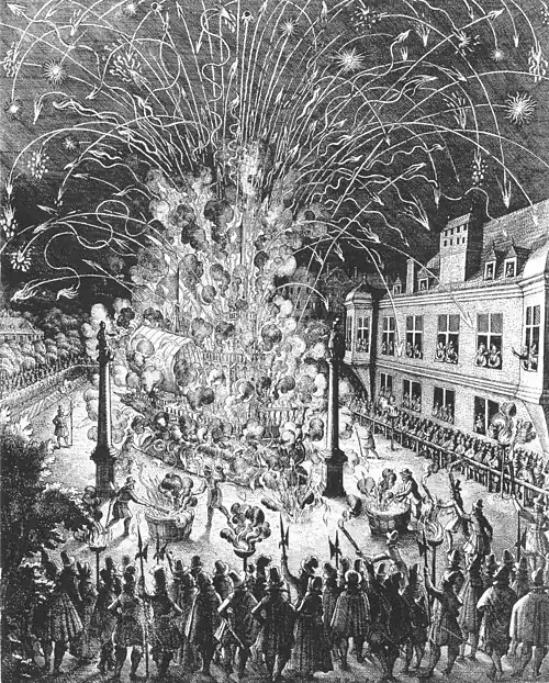 Zum Abschluss der achttägigen Tauffeierlichkeiten für Herzog Friedrich wurde im Stuttgarter Lustgarten ein Feuerwerk abgebrannt. Als Gerüst diente ein Turm auf einem nachgebildeten Schiff, das zwischen zwei Säulen der Alten Rennbahn aufgebaut war. Das Feuer entnahmen die Feuerwerker mit Fackeln aus brennenden Ölbottichen. Rings um die Rennbahn und an den Fenstern des Alten Lusthauses (rechts) drängten sich die Zuschauer. Links das Schießhaus, rechts hinter dem Alten Lusthaus das Alte Schloss. Bildüberschrift (nicht abgebildet): Contrafactur des kunstlichen Feuerwercks so bey des neugebornen Iungen Printzen Friderichen Hertzog zu Wurttemberg & Kindtauffen zu Stuetgart im Lustgarten den 17 Marti Anno 1616 geworffen worden. Quelle: #Repraesentatio 1616. Literatur: #Merian-Druckgraphik 1, Nummer 216, #Wüthrich 2007, Seite 81, #Schefold 1957, Seite 591, Abbildung 288. |