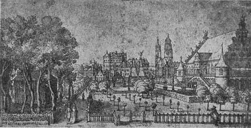 - ↑ Auf der Radierung von 1616 ist das Neue Lusthaus zu schmal dargestellt.