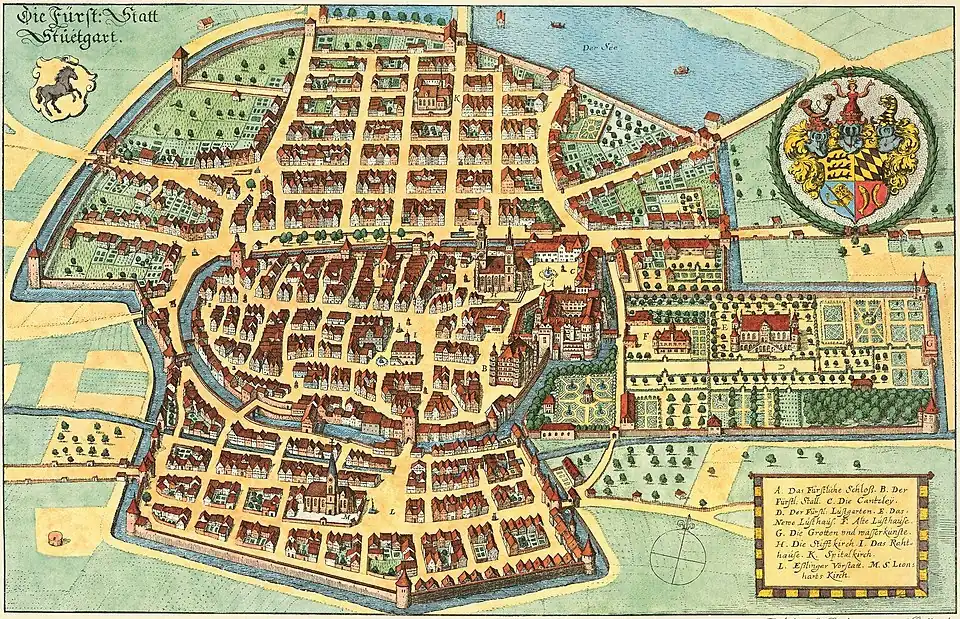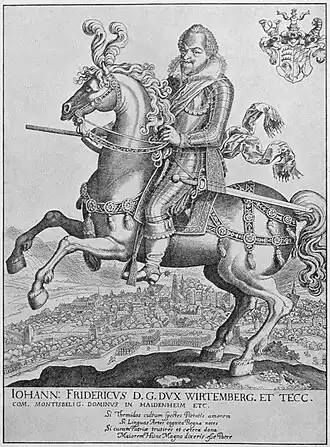 | Reiterbild von Herzog Johann Friedrich von Württemberg mit Ansicht von Stuttgart, Radierung von Matthäus Merian, 1616, 320 × 262 mm. Schefold 7788. Quelle der Abbildung: #Wais 1954.2, Tafel 7.