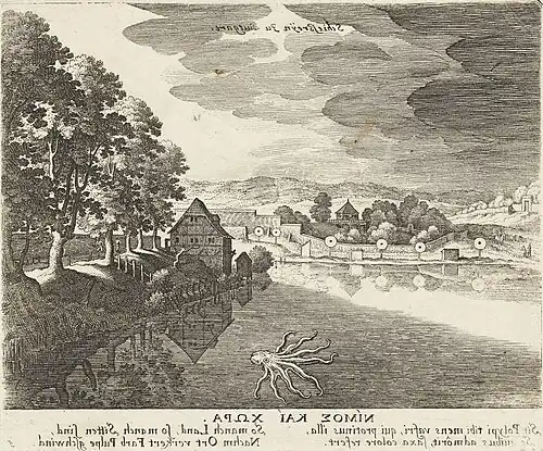 | „Schießreyn zu Stutgart“, Emblem mit Tintenfisch und Ansicht des Schießrains am Büchsensee zu Stuttgart, Radierung von Matthäus Merian, 1624, 120 × 163 mm. Schefold 7785. Quelle der Abbildung: #Novae 1624. – Das im Original seitenverkehrte Bild wurde in der Abbildung gespiegelt, daher wird der Bildtitel in Spiegelschrift angezeigt.