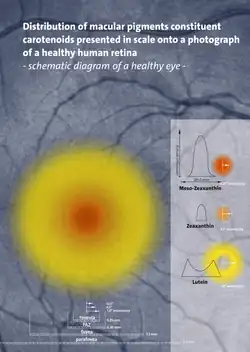 meso-Zeaxanthin, Lutein und (3R,3′R)-Zeaxanthin sind die häufigsten Carotinoide in der Macula lutea, die in einem Verhältnis von 1:1:1 vorkommen und zusammen als Makulapigment (MP) bezeichnet werden.[4] meso-Zeaxanthin ist im Mittelpunkt der Makula konzentriert, wo es etwa 50 % des MP ausmacht, während Lutein in der peripheren Makula dominiert.