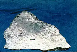Meteoritisches Eisen wurde schon vor der eigentlichen Eisenzeit zur Herstellung von Kultgegenständen, Werkzeugen und Waffen benutzt. So wurden etwa in einem kleinen Gräberfeld aus der Zeit von 3500 bis 3000 v. Chr. bei der ägyptischen Siedlung Gerzeh Eisenperlen mit einem Nickelgehalt von 7,5 Prozent gefunden, was den meteoritischen Ursprung nahelegt. Eine Dolchklinge wurde auch in der Grabkammer des Pharaos Tutanchamun gefunden, von der angenommen wird, dass sie möglicherweise aus meteoritischem Eisen gefertigt worden ist. Zwei 2016 publizierte Analysen der Dolchklinge geben der Annahme eines meteoritischen Ursprungs des Klingenmaterials starke Unterstützung.[15][16][17] Auch heute wird das sogenannte Meteoriteneisen wegen seiner relativen Seltenheit als Schmuck oder als Teil von handgemachten Messern verwendet. Ätzt man Meteoriteneisen mit Säure, zeichnet sich ein Muster ab, da die verschiedenen Metalle unterschiedlich stark von der Säure angegriffen werden. Bei dieser Widmanstätten-Struktur spricht man auch von Meteoritendamast.