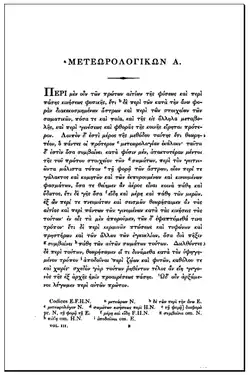 - ↑ Hans Strohm: Beobachtungen zum vierten Buch der aristotelischen Meteorologie. Zweifelhaftes im Corpus Aristotelicum: Studien zu einigen Dubia. Akten des 9. Symposium Aristotelicum (Berlin, 7.-16. September 1981), edited by Jürgen Wiesner, Berlin, Boston: De Gruyter, 1983, pp. 94–115, hier: S. 94.