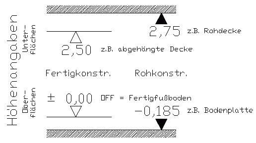 In den Grundrissen und insbesondere in Schnitten werden die Höhenkoten durch Dreiecke gekennzeichnet. Ein offenes (aus Umrisslinien gezeichnetes) Dreieck steht dabei für die Höhe der Oberflächen der fertigen Konstruktion. Ein geschlossenes Dreieck kennzeichnet die Höhen von Decken, Fußböden und anderen horizontalen Flächen im Rohbau.