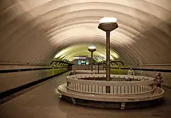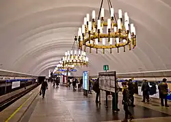 Die Metro Sankt Petersburg (russisch Санкт-Петербургский метрополитен / Transkription Sankt-Peterburgskij metropoliten) ist die U-Bahn der russischen Millionenstadt Sankt Petersburg und zugleich eines der tiefstgelegenen U-Bahn-Systeme der Welt. Die erste Linie wurde am 15. November 1955 eröffnet. Zu Zeiten der Sowjetunion hieß sie nach dem damaligen Namen der Stadt Metro Leningrad (Ленинградский Метрополитен / Leningradskij Metropoliten). Das Metronetz besteht im Jahr 2025 aus fünf Linien mit insgesamt 124,8 km Streckenlänge und 73 Stationen[2]. 2017 wurden täglich im Schnitt etwa 2 Millionen und insgesamt 726,5 Millionen Fahrgäste befördert. Die Petersburger Metro gilt als eine der architektonisch schönsten der Welt.