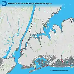 Ende Oktober 2012 überflutete und beschädigte Hurrikan Sandy Teile des U-Bahnnetzes. Der MTA entstand über alle Betriebszweige hinweg ein Gesamtschaden in Höhe von rund 4,75 Milliarden US-Dollar.[18] Aus dieser Erfahrung heraus wurden Hochwasserschutzeinrichtungen an tiefliegenden Stationen, Tunneln, Betriebshöfen und Lüftungsbauwerken eingebaut bzw. vorgesehen. Die MTA war über Jahre damit beschäftigt, ihre Anlagen wieder in einen guten Zustand zu versetzen.