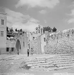 ), dem Symbol der orthodoxen Bruderschaft vom Heiligen Grabe (griechisch Ιερά Αγιοταφιτική Αδελφότητα). Von Westen besteht ein weiterer Zugang direkt neben der Metropolitankirche. An ihrer Westseite erstreckt sich die ساحة الأسقف / Sāḥat al-ʾAsquf / ‚Platz des Bischofs‘ (hebräisch כִּכָּר הַבִּישׁוֹף Kikkar haBīschōf), ein innenhofartiger Platz. Vom Dair al-Muṭrāniyya sind es 350 Meter nordostwärts zur gr.-orth. Wallfahrtskirche der Verkündigung an die Theotokos und 500 Meter südwärts zur röm.-kath. Verkündigungsbasilika.