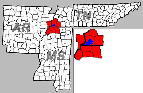 Die Region besteht aus acht Countys im Umland der Stadt Memphis, die sich beiderseits des Mississippi über die drei Bundesstaaten Tennessee, Mississippi und Arkansas verteilen. |