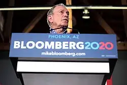Am 24. November 2019 gab Bloomberg seine Kandidatur offiziell bekannt.[21] Für seine Ankündigung, für das Amt des Präsidenten der Vereinigten Staaten zu kandidieren, hat er viel Lob, aber auch viel Kritik erhalten. Dies ist auf die Wahrnehmung zurückzuführen, dass die Demokraten „einen reichen New Yorker Milliardär mit einem noch reicheren New Yorker Milliardär bekämpfen“.[22] Bloomberg trat erstmals am Super Tuesday, dem 3. März 2020, bei den Vorwahlen der Demokraten an. Er hatte bis dahin mehr als eine halbe Milliarde Dollar für die Vorwahlen investiert. Er siegte nur im US-Außengebiet Amerikanisch-Samoa und gewann dort fünf von insgesamt sechs Delegiertenstimmen. Nach dem Rückzug seiner Kandidatur am 4. März erklärte er, nun Joe Biden zu unterstützen.[23] Die Kosten für seinen Wahlkampf, den er ausschließlich selbst finanzierte, beliefen sich insgesamt auf eine Milliarde US-Dollar.[24] Drei Tage nach der Kündigung des Pariser Klimaschutzabkommens durch den neuen US-Präsidenten Donald Trump kündigte Bloomberg an, die entstandene Lücke bei der Finanzierung des UN-Klimasekretariats UNFCCC mit Hilfe seiner Stiftung Bloomberg Philantropies und anderen Geldgebern zu schließen.[25]