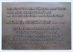 Michael Hirschberg wurde am 17. Mai 1935 durch die politische Polizei verhaftet und im September 1936 vom Volksgerichtshof zu drei Jahren Zuchthaus verurteilt. Der Jurist Hirschberg trat in diesem Prozess „..., mit großer Zivilcourage auf: Er bedauerte ausdrücklich, nicht schon viel früher und noch konsequenter illegal gegen den Nationalsozialismus tätig geworden zu sein!“[1] Nach Misshandlungen starb er 1937 im Zuchthaus Brandenburg-Görden an einem Herzinfarkt.