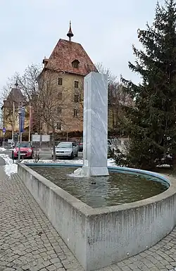 - Wasser-Stele, 2009, vernähter Marmor mit Wasserlauf, 60 × 60 × 350 cm, Millstatt (seit 2011)