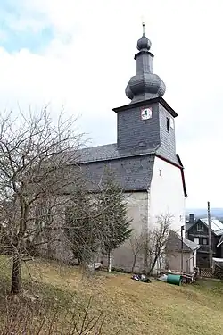 Die Saalkirche wurde 1734–1736 gebaut. Das Kirchenschiff ist mit einem schiefergedeckten Mansarddach bedeckt, aus dem sich im Südwesten der Dachturm erhebt. Das Kirchenschiff ist im Nordosten dreiseitig abgeschlossen. 1968 wurde die Kirche durch Bergbewegungen beschädigt und war bis 1981 gesperrt.