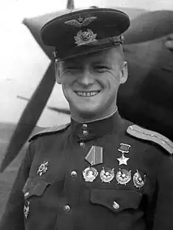 Seine Kriegsverwendung beendete er im Range eines Garde-Majors (der Flieger) mit insgesamt 215 Feindflügen. In diese Zeit gelangen ihm 14 Abschüsse im Luftkampf gegen feindliche Kampfflugzeuge, was für einen Bomberpiloten der sowjetischen Luftstreitkräfte bis dato als unübertroffen galt. Hierfür wurde er mit der höchsten Auszeichnung des Landes „Held der Sowjetunion“ zweifach geehrt. Ausführliche Darstellungen dazu enthält der zusammenfassende Einsatz-Rapport seines damaligen Geschwaderkommandeurs Garde-Oberstleutnant und Held der Sowjetunion Grigori Tschernezow, 155. Garde-Schlachtfliegerregiment, vom 8. Juni 1945, der im Original vorliegt. Seine besonderen Leistungen wurden zudem mehrfach durch verschiedene Befehlshaber der Land- und Luftstreitkräfte im Befehl gewürdigt und formell anerkannt. Ehemalige Crew-Kameraden, Untergebene und Offiziere, die unter seinem Kommando standen, darunter sechs Helden der Sowjetunion, widmeten ihm 1987 ein Buch.