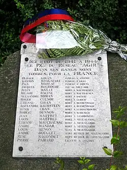- An der Rue de Bercy 207 beim Gare de Lyon in Paris, wo in einem Zimmer des Hôtel d'Annecy die Kommandozentrale von Agir eingerichtet war, liegt eine Gedenktafel mit den Namen der 20 Personen, die im Zusammenhang mit ihren Aktivitäten für Agir ihr Leben lassen mussten.