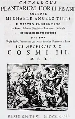 1723 veröffentlichte Michelangelo Tilli den Catalogus Plantarum Horti Pisani. Das Verzeichnis der im Botanischen Garten von Pisa kultivierten Pflanzen umfasst mehr als 4500 Einträge und ist dem Großherzog Cosimo III. de Medici gewidmet. 50 Arten des Kataloges sind mit Zeichnungen von Cosimo Mogalli illustriert.