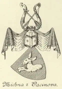 Die Michna stammen aus Budyně nad Ohří und stiegen innerhalb von nicht ganz 30 Jahren aus der Erbuntertänigkeit in den Herrenstand des Königreichs Böhmen auf. Martin genannt Michna, Hasenburg´scher Amtmann der Grundherrschaft Budin an der Eger, wurde von Kaiser Rudolf II. am 14. August 1598 in Prag, der böhmische Adel im Wladykenstand mit dem Adelsprädikat „von Waczynow“ und ein Wappenbrief verliehen.[1] Waczynow (heute Vacinov) war vermutlich ein ehemaliger Gutshof im Mündungsgebiet der Eger in die Elbe im Leitmeritzer Kreis. Bei der Übernahme in die deutsche Sprache kam es zu verschiedenen Schreibformen. Seine drei Söhne begründen mit Paul Michna von Waitzenhofen das ältere gräfliche Haus, mit Sebastian Michna von Waczynow (Weitzenau) das jüngere gräfliche Haus und mit Georg Wilhelm Michna von Waiczenhoff das freiherrliche Haus.