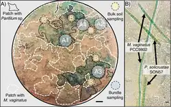 - ↑ a b c Estelle Couradeau, Ana Giraldo-Silva, Francesca De Martini, Ferran Garcia-Pichel: Spatial segregation of the biological soil crust microbiome around its foundational cyanobacterium, Microcoleus vaginatus, and the formation of a nitrogen-fixing cyanosphere. In: Microbiome, Band 7, Nr. 55, 3. April 2019; doi:10.1186/s40168-019-0661-2 (englisch).