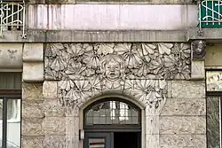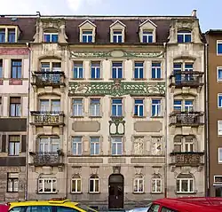 Am auffälligsten ist wohl der aus Sandstein gehauene Schmuck des Einganges von Bundschuhstraße 5: Ein rufender Frauenkopf inmitten nur leicht stilisierten Kastanienlaubs. Das Motiv des aus einem Blätterwald herausrufenden Frauenkopfes findet sich in abgewandelter Ausführung an mehreren Dresdner Gebäuden, so etwa am Wohnhaus Katharinenstraße 1 in der Äußeren Neustadt, das ebenfalls 1903 errichtet wurde. Zum ersten Mal wurde das Motiv vermutlich 1897 über dem Portal des Hauses König-Albert-Straße 29 (heute Albertstraße; das Haus wurde im Krieg zerstört) verwendet. Es war eine Arbeit des Dresdner Bildhauers Eduard Jungbluth, die Urheberschaft ist unklar.[4]
