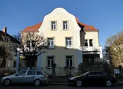 Das zweigeschossige Haus mit Walmdach hat eine Fassade, deren Frontlänge vier Achsen breit ist, wobei ein mittig angebrachter Risalit zwei Achsen beansprucht. Der Risalit zeigt als oberen Abschluss einen Schweifgiebel mit reicher Stuckornamentik im Jugendstil.[1]