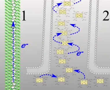 Die Nanodrähte von Bakterien der Gattung Shewanella haben einen grundsätzlich anderen Aufbau. Es handelt sich nicht um Pili, sondern um Ausstülpungen der Periplasmamembran, die eine Länge von bis zu 9 µm erreichen.[4] In ihnen sind Häm-Moleküle angereichert, und zwar die Cytochrome MtrC und OmcA.[5][6] Ihr Nachweis in der Äußeren Membran und der Verlust der Leitfähigkeit bei Mutanten mit MtrC und OmcA -Defekt[7] lässt vermuten, dass die Leitfähigkeit der Shewanella Nanodrähten auf diesen Cytochromen beruht.[8][9] Es wurde ein an Elektroden verifizierter Mechanismus vorgeschlagen, nach dem ein Elektronen-„Hopping“ (Hüpfen) zwischen den gelösten Cytochromen die Leitfähigkeit bewirkt[1][10] (siehe Abbildung). 2020 entwickelten Forscher mit Hilfe der leitfähigen mikrobiellen Nanodrähten von Geobacter sulfurreducens einen „Memristor“, der bei elektrischen Spannungen von weniger als 100 mV funktioniert. Der „Memory Transistor“ erlaubt den Betrieb durch Aktionspotenziale von natürlichen Neuronen und kann Biosensor-Signale lokal verarbeiten. Die Technologie könnte für Gehirn-inspiriertes Computing und direkte Kommunikation mit biologischen Gehirnzellen eingesetzt werden.[11][12]