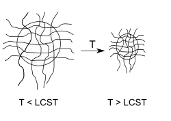 Wird die Phasenübergangstemperatur von 32 °C überschritten, wird das Poly-N-Isopropylacrylamid in Wasser unlöslich und fällt aus der Lösung aus. Dieses Verhalten wird bei linearen Polymeren als untere kritische Lösungstemperatur (engl. lower critical solution temperature, LCST) bezeichnet. Im Gegensatz zu linearen Polymeren, können Mikrogele nicht molekular gelöst werden. Aus diesem Grund spricht man bei temperaturresponsiven Mikrogelen nicht von der LCST, sondern von der sogenannten Volumenphasenübergangstemperatur (engl. volume phase transition temperature, VPTT)[9]. Oberhalb der VPTT kollabieren die Mikrogele und geben das eingeschlossene Lösungsmittel an die Umgebung ab. Unterhalb der VPTT sind die Mikrogele vom Lösungsmittel durchdrungen und somit gequollen. Abhängig vom Vernetzungsgrad und dem Lösungsmittel von dem ein Mikrogel durchdrungen wird, ist das Mikrogel unterschiedlich stark gequollen.