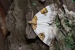 - Der Sturmvogel (Melanthia procellata) ist durch einen nahezu viereckigen weißen Fleck im dunklen Saumband zu erkennen.