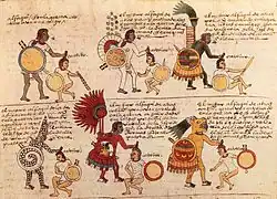 Die aztekischen Krieger trugen stark gepolsterte Koller. Das Gewebe war mit einer Lake gehärtet und hieß Ichcahuipilli. Es bestand aus Baumwoll- und Agavenfasern und konnte den ganzen Körper oder auch nur den Oberkörper und den Bauch bedecken. Diese „Rüstung“ war so dick wie zwei Finger und ausreichend, die Krieger vor Pfeilen und anderen Wurfgeschossen zu schützen. Dazu kam der runde Schild (Chimalli) aus Holz oder geflochtenen Fasern. Manche Schilde waren aus sehr dicker Baumwolle und ließen sich für den Marsch zusammenrollen.[3] Es gab auch prächtige geschmückte Schilde (māhuizzoh chimalli), die mit vielen Federn verziert waren. Für den Krieg putzten sich die Krieger festlich heraus. Sie schmückten sich mit einer kunstvollen Kriegsbemalung und mit vielen schönen Federn. Manche trugen geschnitzte Helme aus Hartholz auf dem Kopf, welche verschiedene Tiere symbolisierten.