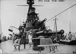 Die Deckszene zeigt die Vorder- sowie die Steuerbord-Hauptartillerie