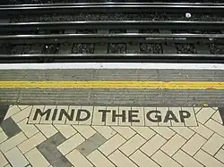 Besonders angebracht erscheint die Vorsichtsmaßnahme bei den älteren Streckenabschnitten der London Underground. Sie folgen exakt dem Verlauf der über ihnen liegenden Straßen, sodass die Bahnsteige teilweise in leichten Kurven liegen. Dort entstehen beim Halt eines Zuges gefährliche Lücken zwischen diesem und dem gekrümmten Bahnsteig.[1] In Ermangelung von Vorrichtungen zur Überbrückung der Lücke, wie es sie zum Beispiel in einigen Stationen der New York City Subway gibt, ergeht bis heute die Warnung in Wort und Schrift, auf die gefährliche Lücke achtzugeben, um nicht hineinzustürzen. Sie erfolgt per Ansage bei Einfahrt eines Zuges (im Inneren des Zuges etwas ausführlicher: „Mind the gap between the train and the platform“) sowie auch in Form eines Schriftzugs am Bahnsteigrand. Es wird gleichfalls an den Strecken gewarnt, wo die Bahnsteighöhe nicht optimal an das Rollmaterial angepasst werden kann. So müssen auf der Piccadilly Line und der District Line Fahrzeuge mit unterschiedlicher Fußbodenhöhe (Röhrenbahn und Großprofil) einige Stationen gemeinsam benutzen. Dort ist die Bahnsteighöhe ein Kompromiss aus den unterschiedlichen Erfordernissen. Bei den überregionalen South West Trains lautet die Ermahnung: „Please mind the gap between the train and the platform edge.“