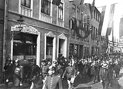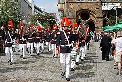 - 11. Nach dem Vorbeimarsch wird am Aufgang zum Simeonsplatz haltgemacht, damit die Spielleute wieder die Spitze einnehmen können.