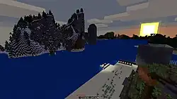 - Das Ende ist eine Dimension, in der man einen Boss, den Enderdrachen, besiegen kann. Erreichen kann man diese nur durch ein Endportal, welches in einer Festung (Englisch: Stronghold) liegt. Es gibt in der gesamten Oberwelt insgesamt 128 Festungen. Wenn der Drache besiegt wurde, wird der Spieler mit Erfahrungspunkten belohnt, gleichzeitig wird das Endportal, mit dem man das Ende verlassen kann, aktiviert, und es erscheint ein Endtransitportal. Wenn man in das Endportal springt, folgt ein von Julian Gough geschriebener Abspann, der das Spiel jedoch nicht beendet.[15] Wenn der Spieler eine Enderperle in das Endtransitportal wirft, wird er zu einem ca. 1000 Blöcke entfernten weiteren Endtransitportal teleportiert. In dieser Entfernung befinden sich viele Nebeninseln, auf denen sich Endsiedlungen und Endschiffe befinden. Diese Inseln schweben allerdings im Nichts (im Englischen wird es als Void bezeichnet), in das man fallen kann, wobei die Spielfigur getötet (unter −64 Blöcken erleidet die Spielfigur Schaden) und zurück in die Oberwelt versetzt wird. Das Endtransitportal ist von unzerstörbarem Grundgestein umgeben und kann deshalb nicht direkt betreten werden. Stattdessen muss man eine Enderperle hineinwerfen, um hindurch zu reisen, mit Elytren hindurchfliegen oder hindurchkriechen/-schwimmen.