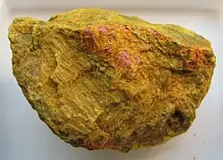 | Krusten, Ausblühungen (Effloreszenz), Anflüge und Beschläge | Viele Sekundärminerale überziehen Primärminerale, aus denen sie z. B. durch Verwitterung entstehen, mit dünnen, krustigen Überzügen oder Ausblühungen. Weitere, diese Aggregatform bezeichnende Begriffe sind Anflüge, Beläge und Beschläge. Bekannt sind unter anderem die oft ineinander übergehenden Azurit-Malachit-Ausblühungen sowie Schwefelkrusten an Fumarolen. | ![]() |