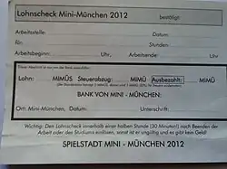 Die Währung, die sogenannten MiMüs, ist Spielgeld. Sie gelten immer nur für eine Spielsaison und werden jedes Mal neu gestaltet.[3] Das Design des Sonderscheins der Spielsaison wird durch einen Wettbewerb für Kinder bestimmt. Auf jedem Schein steht seit 2006 Ehrlich währt am längsten.
