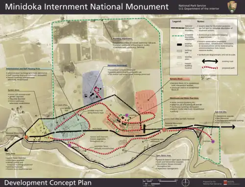 Auf dem Gelände standen damals nur einige Ruinen von Bauwerken des Verwaltungsbereichs sowie eine kleine Informationstafel. Bereits seit 2002 laufen Planungen für den Ausbau der Gedenkstätte.[15] 2005 wurde eine Studie über die Geschichte und Bedeutung des Lagers fertiggestellt, bis 2006 ein Management-Plan erarbeitet und im Dezember 2006 die Finanzierung bereitgestellt. Das Konzept sieht vor, das Gelände zu erweitern, einen Barackenblock, die Honor Roll, und einige weitere Einrichtungen zu rekonstruieren und im ehemaligen Verwaltungsbereich ein Besucherzentrum und Nebengebäude zu errichten. Unmittelbar außerhalb des ehemaligen Wohnbereiches, an einem Bogen des Kanals, soll eine landschaftlich gestaltete Erinnerungsstätte für die Issei, die japanischen Einwanderer der ersten Generation, entstehen. Für diese gesonderte Stätte fand im Laufe des Jahres 2007 ein Architekturwettbewerb über die Gestaltung statt.