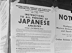Nach dem Angriff auf Pearl Harbor und dem Eintritt der Vereinigten Staaten in den Zweiten Weltkrieg vom Dezember 1941 wurden auf der Grundlage weitverbreiteter rassistischer Vorurteile und in Fortsetzung verschiedener diskriminierender Einschränkungen nicht nur japanische Staatsangehörige in den Vereinigten Staaten, sondern auch alle amerikanischen Staatsbürger japanischer Abstammung als Sicherheitsrisiko eingestuft (Enemy Alien, „feindlicher Ausländer“). Am 19. Februar 1942 unterzeichnete Präsident Franklin D. Roosevelt die Executive Order 9066, auf deren Grundlage große Teile der Pazifik-Anrainerstaaten zum Sperrgebiet erklärt wurden. Alle Bewohner Kaliforniens, des westlichen Oregons und Washingtons, eines kleinen Streifens im Süden Arizonas sowie Hawaiis und Alaskas mit japanischen Vorfahren wurden durch die War Relocation Authority (Kriegs-Umsiedelungs-Behörde) in Internierungslager östlich der Pazifik-Region eingewiesen. Eine vergleichbare Ermächtigung zur vollständigen Internierung von deutsch- und italienischstämmigen Bewohnern der Ostküste wurde nur nach Einzelfallprüfung umgesetzt. Die Internierten wurden unter anderem auf Ellis Island festgehalten.