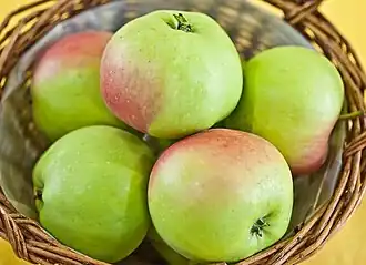 Reifezeit Mitte Oktober, die Frucht hält bis Februar. Welkt nicht auf dem Lager. Die mittelgroßen eher flachgebauten Äpfel haben eine glatte, mittelfeste Schale und sind gelblich grün. Weitere Kennzeichen der Schale sind ihre feinen Sprenkel, und die verwaschene Deckfarbe ist hell bräunlichorange. Die druckempfindliche Liebhabersorte neigt etwas zu Fruchtfäule, außerdem zu Kleinfrüchtigkeit bei zu reichem Behang.