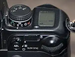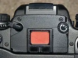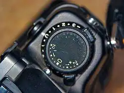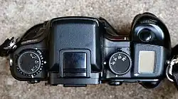 Neben Verschlusszeit und Blendenzahl werden auch die anderen Parameter der einzelnen Kamerafunktionen über die zwei Einstell- oder Wahlräder justiert. Das vordere Rad bedient man mit dem Zeige- oder Mittelfinger, das hintere mit dem Daumen der rechten Hand. Stützt man das Objektiv mit der linken Hand ab, können beide Räder bedient werden, ohne die Kamera vom Auge absetzen zu müssen; hält man die Kamera nur in der rechten Hand, kann ohne Übung oder Handschlaufe nur das vordere Einstellrad bedient werden, da Daumen und Handballen die Kamera stützen; dafür ist extra eine Daumenstütze vorgesehen.