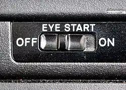 Durch die Kombination aus IR-Sender und -Empfänger in Form einer Reflexlichtschranke kann die Kamera die Annäherung ans Auge feststellen. Diese Funktion ist allerdings umstritten, in den Worten des Fachautors Thomas Maschke: „Am Eye-Start scheiden sich die Geister.“[Literatur 2] Um den Stromverbrauch zu minimieren und eine unbeabsichtigte Aktivierung der Kamera zu verhindern wird der Eye-Start-Sensor normalerweise erst über den Griffsensor zugeschaltet; die Kamera kann über die Individualfunktion 7 bei Bedarf jedoch auch so konfiguriert werden, dass der Eye-Start-Sensor sofort aktiviert wird, sobald die Kamera über den Hauptschalter eingeschaltet wird. Wie fast alle Funktionen kann der Eye-Start mit einem Handgriff auch ganz abgeschaltet werden, beispielsweise wenn die Erkennung in Verbindung mit einer Sonnenbrille nicht zuverlässig funktioniert. Der Schiebeschalter lässt sich über die Individualfunktion 15 (s. o.) auch zu einer Verriegelung für die Einstellräder umwidmen.