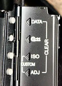 Mit der als Zubehör erhältlichen Datenrückwand DM-9 lässt sich diese Funktionalität sowohl automatisieren als auch erweitern. Die DM-9 speichert die o. g. Parameter sowie einige weitere wie Uhrzeit und Datum (insgesamt 18) von bis zu 400 Filmen à 36 Aufnahmen auf einer FAT12-formatierten SmartMedia-Speicherkarte mit einer Kapazität von 2 (oder 4) Megabyte.[16] Mit 8- (oder 16-)Megabyte-Speicherkarten erhöht sich die Speicherkapazität auf 900 Filme. Größere Karten sind laut Spezifikation nicht einsetzbar. Die Karte kann problemlos am PC ausgelesen und dort weiterverarbeitet werden. Als Datenformat wird eine universell verwendbare, per Tabulatorzeichen getrennte Textdatei verwendet. Darüber hinaus kann die DM-9 auch eine Auswahl aus einer Gruppe von sieben Parametern registergenau in die Filmstege einbelichten, ohne dass die Informationen auf den Bildern selbst sichtbar werden. Eine reine Datenrückwand gibt es unter dem Namen QD-9.[Anmerkung 4]