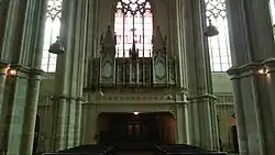 Die Empore ist über dem Hauptportal zwischen den Stützpfeilern errichtet worden und trägt die historische Orgel. Hinter der Orgel am großen Mittelfenster befindet sich die einzige große Glasmalerei der Minoritenkirche. Sie stellt die Heilige Cäcilia an der Orgel spielend umgeben von musizierenden Engeln dar, sowie den hl. Johannes den Täufer und die hl. Katharina von Alexandria.[25]