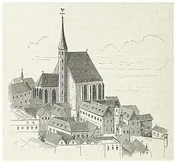 Darstellung der Kirche mit erhaltenem Turm und Langchor neben dem gleichnamigen Kloster; das Kloster befand sich im Süden der Kirche. (Geschichte der Stadt Wien, 1872)