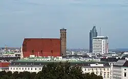 Im Osten des Gotteshauses beherrscht der um 1350–60 errichtete Kirchturm[24] samt Glockenstube die Ansicht. Er hat einen quadratischen Grundriss und ist 65 Meter hoch. Der Turm geht in Höhe der Dachtraufe bei etwa 25 m in ein schlankeres achteckiges Bauteil über. An dieser Stelle befindet sich an der Fassade eine eher kleine steinerne Figur, die den Laienbruder Nikolaus darstellt.[8] Unmittelbar neben dem Turm stehen zwei ungleiche kleinere Rundbauten, einer ist der Treppenturm zur Empore, der andere ist das Sakristeihaus.